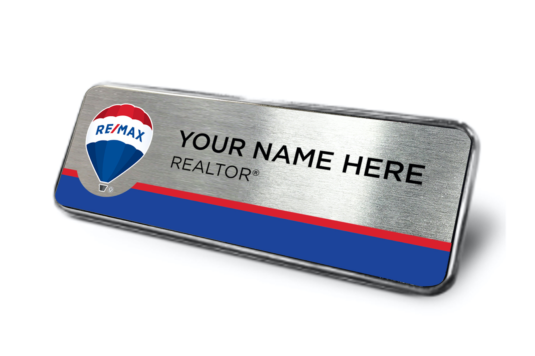Framed Name Tag – Silver/Blue RE/MAX Balloon 1×3 Name Tag