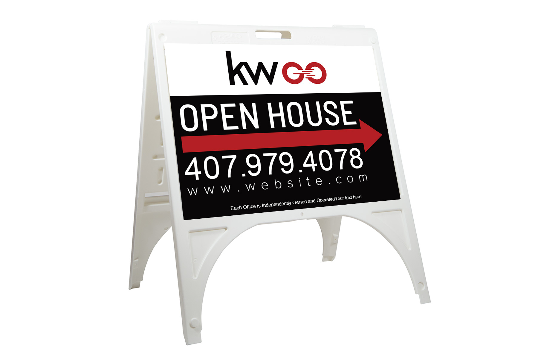 Quik Sign® frames hold two 24″W x 18″H signs and are available with 4mm Coroplast. They are equipped with the Quick-Change™ feature for easy installation. The frame is made of plastic making it suitable for outdoors use. Quik Sign® frames can also be paired with 24″W Rider signs making them an ideal choice for real estate signage.